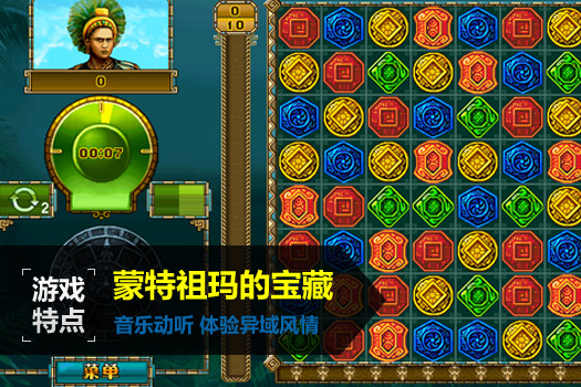 《蒙特祖玛的宝藏》是最成功的游戏之一,此游戏是个消除类的游戏,符合“二个一换,三个一消”的基本规则,虽然这样规则的游戏有很多,但它是集“图片、动画、音乐、声效、操作性和艺术性”于一身的游戏,可谓经典休闲游戏,不失为茶余饭后的娱乐精品。