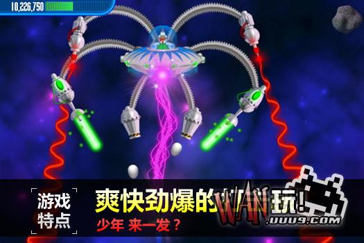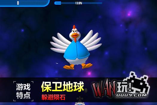 这是一款有趣的射击游戏,玩家将驾驶超级战机与许多的怪鸡对抗。除了与怪鸡作战之外,还要躲避众多陨石的攻击。这些陨石掉落速度很快,而且数量众多,一时并无法全部清除,所以如何有效躲避是本游戏的一个重要技巧。