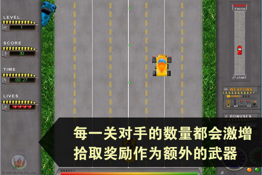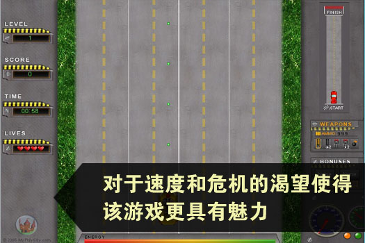 采用危险的方式消灭敌人以完成最初的任务。对于速度和危机的渴望使得该游戏更具有魅力。每个游戏关都必须在限定的时间期限内闯出一条充满障碍的新的路线。对手的汽车将会拦截你的去路让你失去游戏机会。每一关对手的数量都会激增。拾取诸如超级引擎和装甲这样的奖励作为额外的武器。