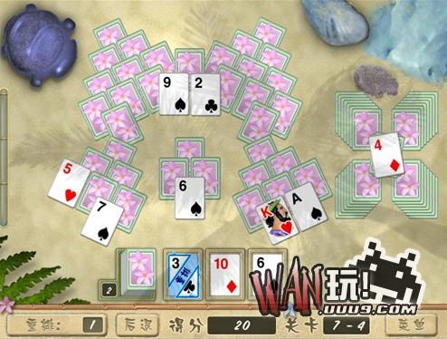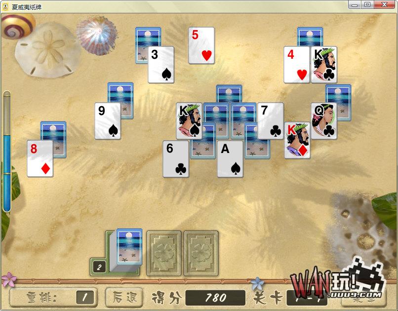 一款以夏威夷沙滩风情为主题的纸牌游戏,炎炎夏日,在家里一样能享受到凉爽的海风,看到沙滩上的贝壳。游戏中虽然是纸牌,但确是一个点击消除类游戏,两个相同数字的纸牌就可以消除,不分花色。