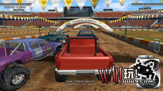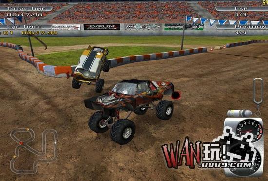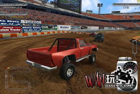 驾驶一辆4X4,马力高,有比几个人高,有力大无穷的车在赛道中行走.赛道也是怖满泥泞的,既湿又滑,共16条,6辆车。