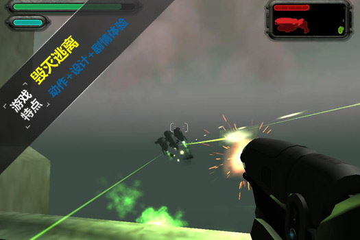 “毁灭逃离”是一款第一人称3D射击游戏,游戏的内容并不多,你要在操纵一个未来战士在巨大基地中击败敌人,还要面对巨型机器人的挑战,游戏的界面和大多数第一人称射击游戏类似,不过小巧的容量和简单的情节可以让你迅速体验一把射击的快感。