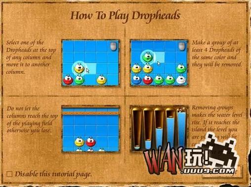 《Dropheads》是一款益智消除游戏,玩家必须将上方掉落的各种颜色的生物做排列,当有四个相同颜色的生物排列在一起才能消除。如果玩家一直持续无法消除的话,将会使这些生物碰到顶端,也就是结束游戏的时候。