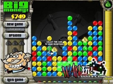 游戏中会不停从下方出现不同颜色的硬币,消除硬币后,在右边的计数柱会增加一个金币,随着金币的增加一直到增加最上面的钱袋,游戏画面中就会出现一个钱袋,钱袋随着下降到接近底部时,也会因为硬币的消除而飞进你的囊中,每一关要得到一定数量的钱袋才能过关。