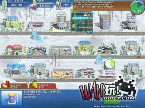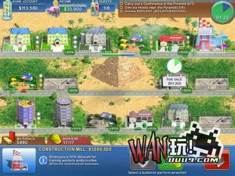 游戏把舞台限定在23个世界名城中,玩家可以经营汽车旅馆,体验小本经营的快乐与艰辛,也可以建造豪华高层酒店,向着五星级大酒店的目标进发。城市、郊区、名胜三种类型的19种风格各异的旅馆定能满足玩家腾飞梦想的需要。