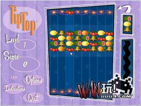先选中一个水果,然后在它上下左右的任一旁边位置点鼠标,即可将两个水果调换位置。如果此时在一条直线上有三个以上连在一起的同种水果,牛牛就可以将它们取走。 每种水果牛牛的喜欢程度不一样,得分也不一样哟;而且每关中牛牛的换盘次数可是有限的。随着关数的提高,限制的时间就会越来越少。 得分计算是这样子的:得分=关联消去的水果数的平方+水果的附加分;如果一次操作导致了多个关联的消去,则得分累加;程序提示一次扣50分。 水果的附加分为:苹果七分,香蕉六分,桃子五分,菠萝四分,柑子三分,樱桃二分,梨子一分。 当屏幕上无解时,游戏将结束。(规则被更改了,呵呵!) 游戏技巧是:先在界面下方进行操作,这样可以会导致多次的关联消去~~~~,另外是要特别选择一次多个的关联消去和附加分高的操作。 呵呵,让我们开始水果大餐吧!