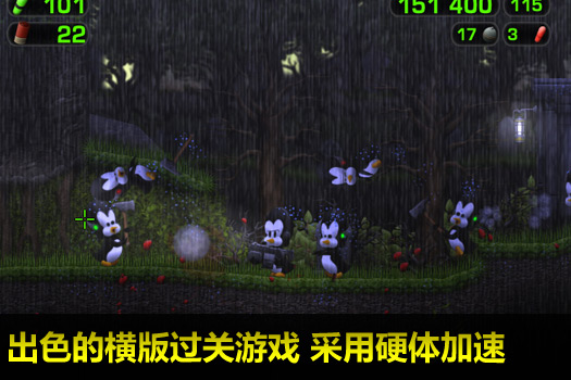 出色的横版过关游戏,採用硬体加速,光影效果非常优秀。玩这游戏的前提是你必须能够杀可爱的企鹅,虽然如此,为了前进,还是不得不杀出一条路来,对了,敌人会不断的产生,所以很容易手忙脚乱,选择强力的武器是绝对必要的。有些关卡可以驾驶武装直升飞机,以及潜水的关卡。
