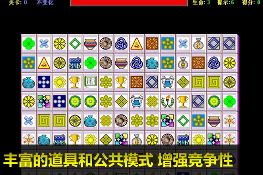 本版集合了10款最流行的连连看游戏,他们是水晶连连看,宠物连连看,麻将连连看,糯米猪连连看,麻雀连连看,花花连连看,开心连连看,果蔬连连看,超女连连看。需要玩更多小游戏的可以去这里。更多连连看需要选择一对相同的图案连线,但此连线是在避开其他图案后,呈现的路径以不超过两次转弯,如符合规定则消除此对图案而得分。